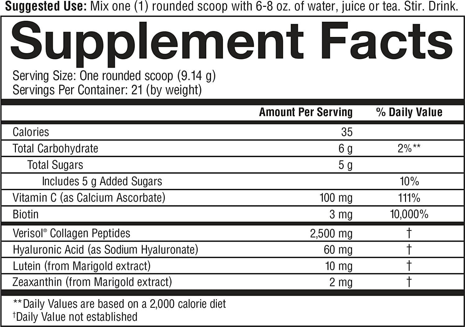 - SKIN FOOD NUTRIENTS: This unique combination of Verisol Collagen Peptides, Hyaluronic Acid, Lutein and Zeaxanthin can help combat the visible signs of aging, while boosting the skin's antioxidant defenses.