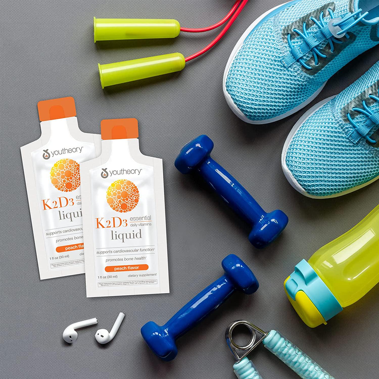 bone health, calcium absorption, cardiovascular function, liquid peach flavor, single serving packets, youtheory k2d3