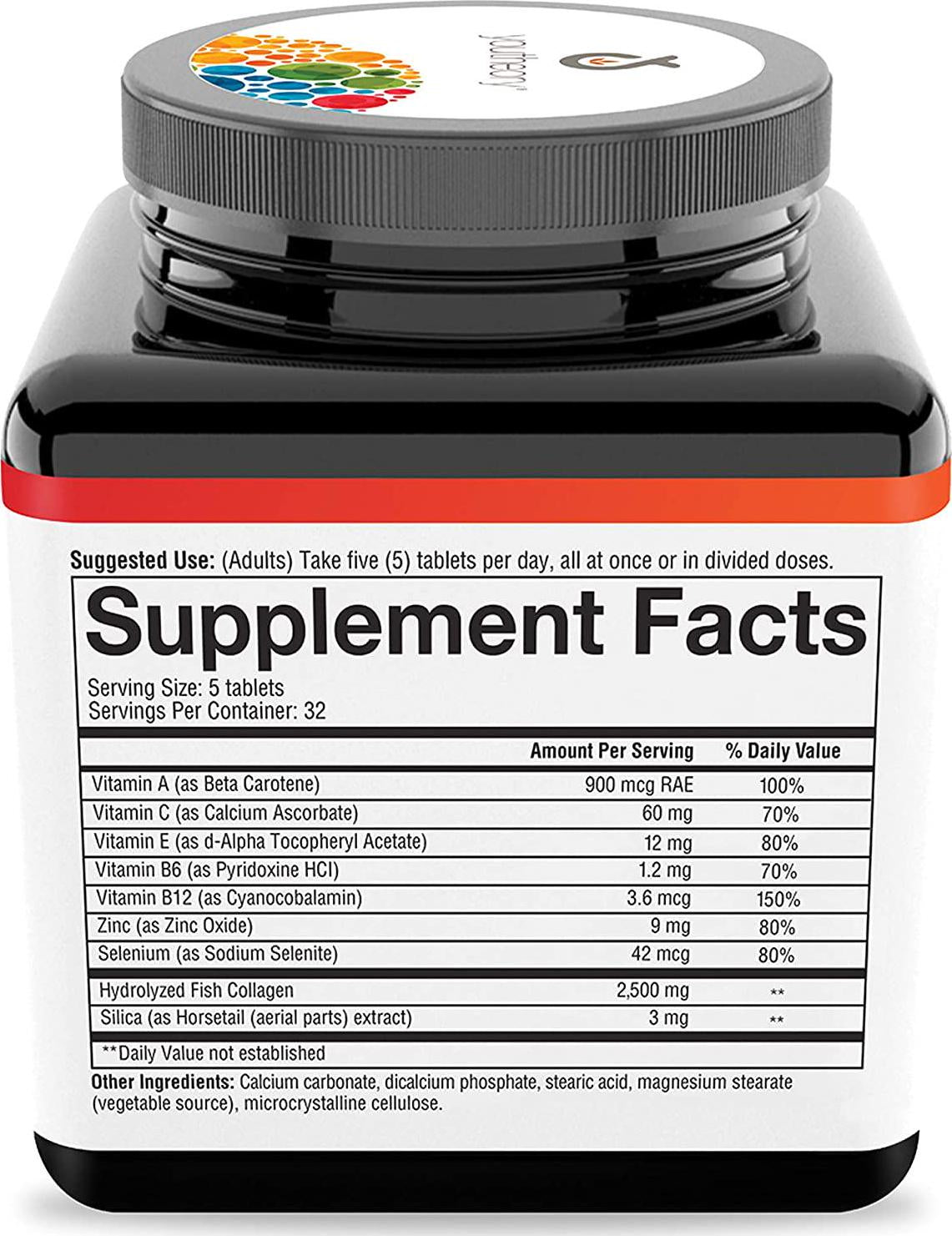 - MARINE COLLAGEN TABLETS: Collagen diminishes with age. Youtheory Marine Collagen helps replenish this vital protein to revitalize skin, hair, nails, tendons & ligaments. This fish-sourced formula is processed to improve digestibility & absorption.