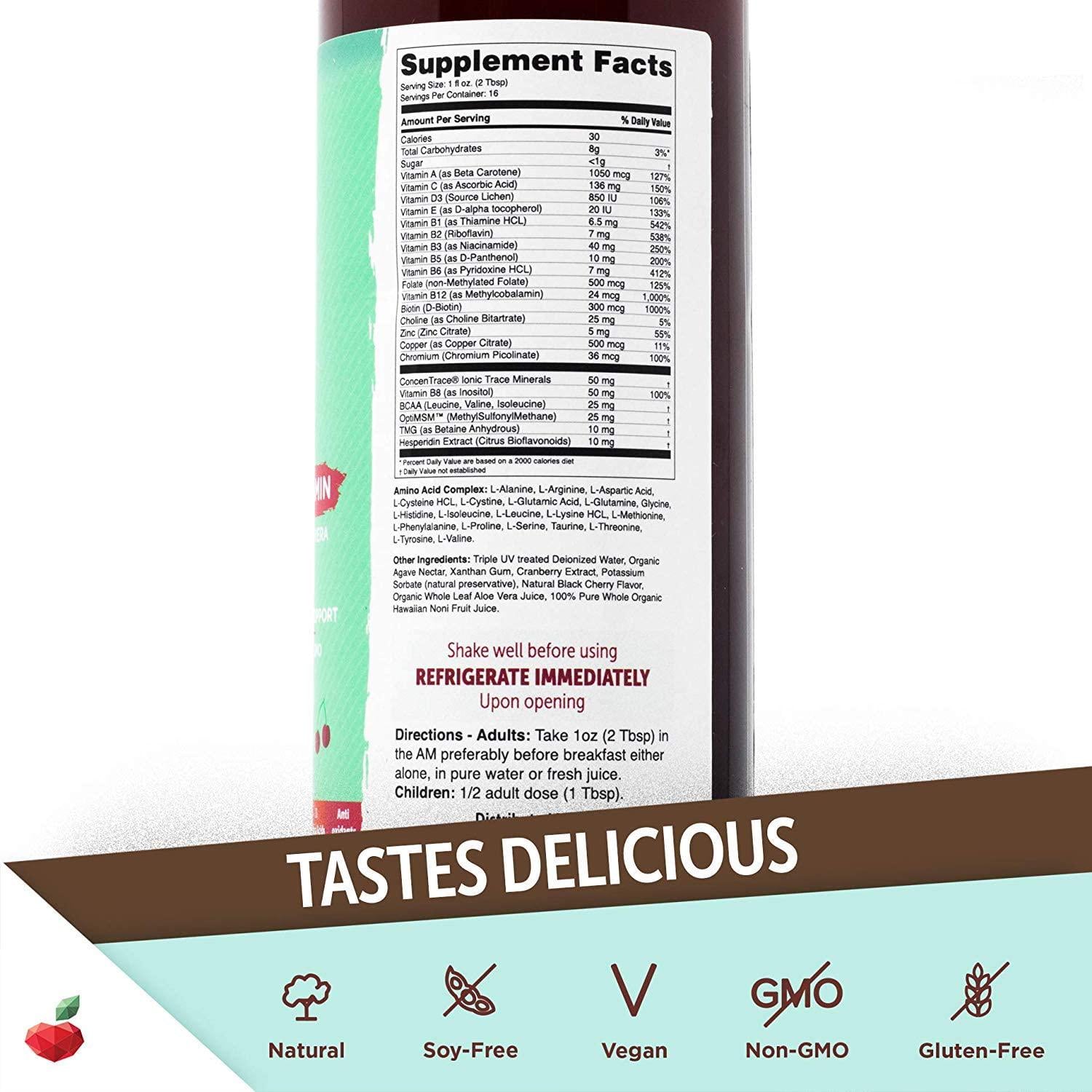 - MADE WITH ORGANIC INGREDIENTS: Only the purest plant based ingredients. This multi include 100% of your daily needed dosage for optimal daily function: Vitamin A, C, D3, E, B1, B2, B3, B5, B6, B7 (biotin), B8 (inositol), Vegan B12 (Methylcobalamin), OptiMSM, Multimineral, BCAA, TMG, Cranberry, Agave nectar, Hawaiian Noni & Aloe Vera juice.