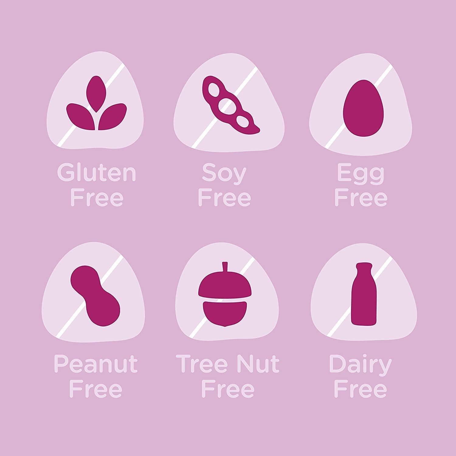 - FREE OF: peanuts, tree nuts, dairy, gluten, soy and eggs.