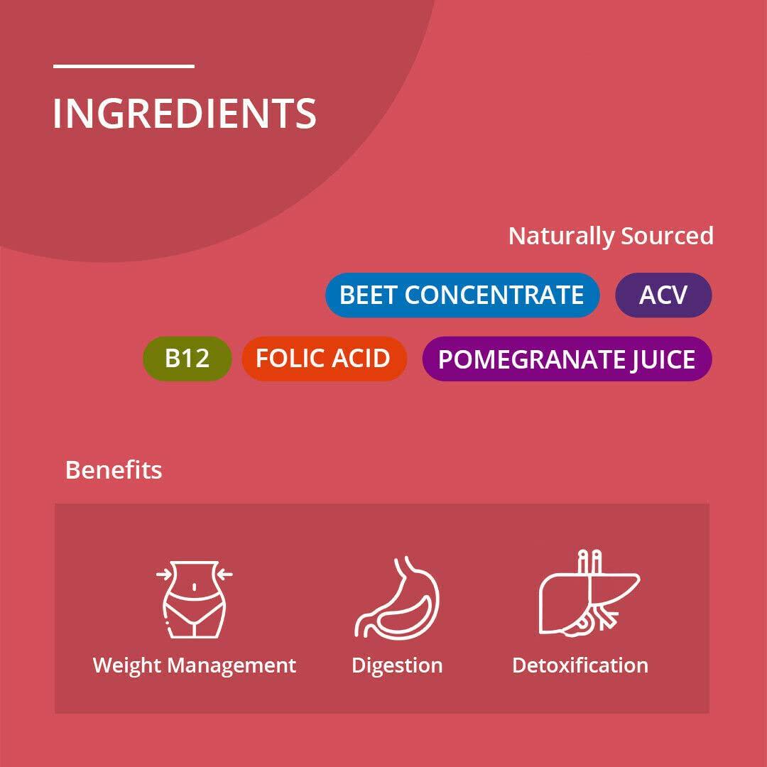 - These amazingly sweet gummies give you the great taste of fresh apples. You now get the power of raw Apple Cider Vinegar with the mother and enriched with Folate, Vitamin B12, Beetroot and Pomegranate juices all of which help with digestion and detox, and give your body the immunity boost it deserves.