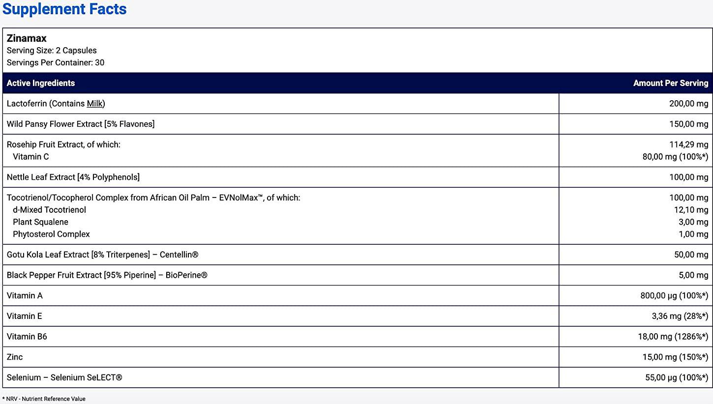 Who is Zinamax for?Zinamax is a multi-ingredient food supplement for people with skin prone to acne and blemishes. Its advanced formula combines only natural ingredients which are extremely helpful in taking care of the good condition of acne-prone skin. The synergy of Zinamax ingredients allows for effective reduction of pimples and supports the maintenance of proper health and appearance of the skin. This is a product recommended for both women and men - regardless of the cause of acne (* Contains Milk). What does Zinamax contain? Lactoferrin