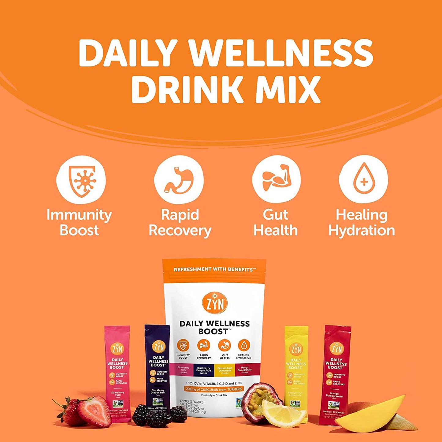 - How to - Shake or Stir 1 Daily Wellness Boost Drink Mix powder packet with 16 to 20oz of cold water depending on your preference. Enjoy the great-tasting Daily Wellness Drink Mixes in 4 thirst-quenching flavors: Strawberry Yuzu, Mango Pomegranate, Blackberry Dragon Fruit, and Passion Fruit Lemonade.
