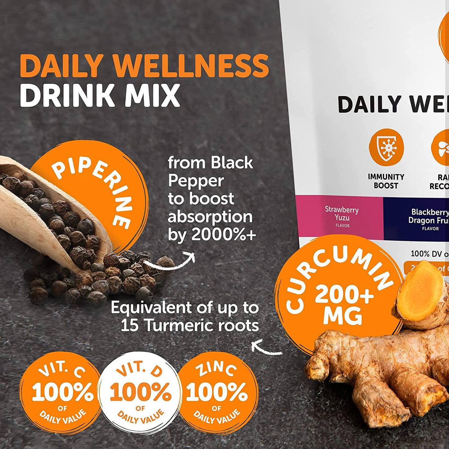 - Accelerates Recovery - Research suggests Curcumin supports a healthy immune response, which can speed up recovery from vigorous exercise. Every wellness formula drink mix contains 200mg of Curcumin from Turmeric and Piperine (black pepper) to optimize absorption.